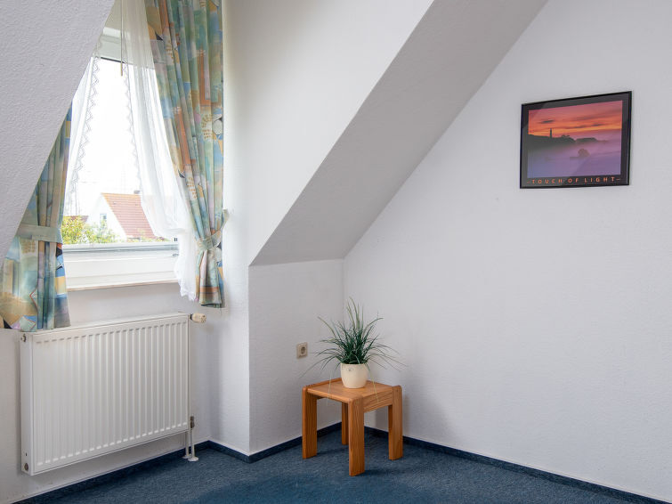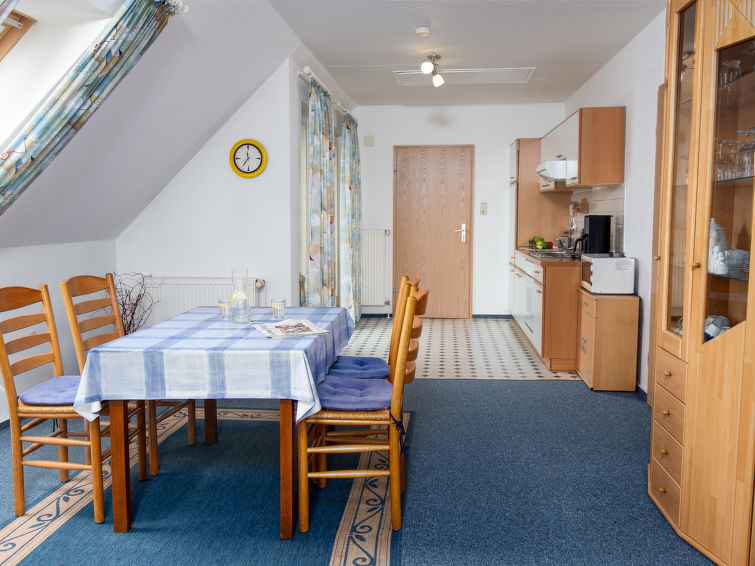 "Mantelmöwe", appartement 2-kamers 65 m2, op de bovenste verdieping. Afgeschuinde daken, gezellig ingericht: woon-/eetkamer 32 m2 met Kabel-TV (Flatscreen TV), stereo-installatie. Uitgang naar het balkon. 1 kamer 13 m2 met 1 2-pers bed (2 x 90 cm, lengte 200 cm). Kookhoek (4-pits kookplaat, oven, broodrooster, waterkoker, magnetron, elektrische koffiemachine). Douche/WC. Balkon 10 m2, op het noordwesten gelegen en op het westen gelegen. Balkonmeubilair. Ter beschikking: kinderstoel (extra), haardroger. Internet (Internet (WiFi), gratis). Niet rokers woning. Rookmelders.