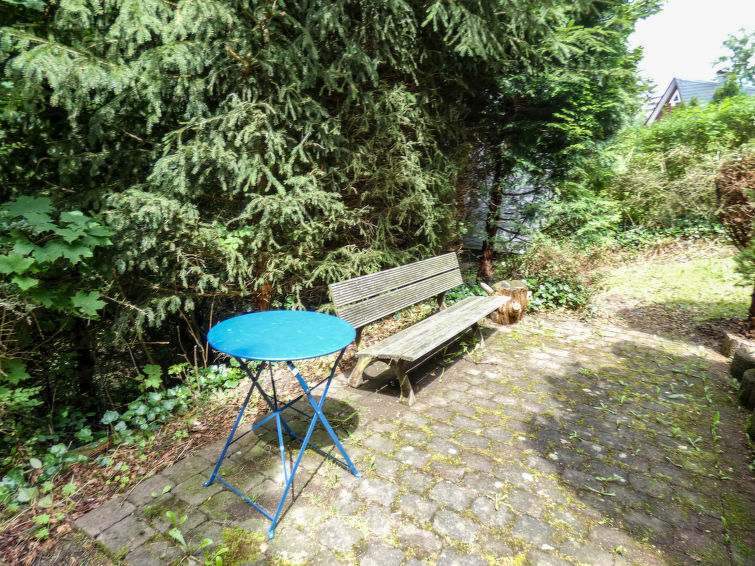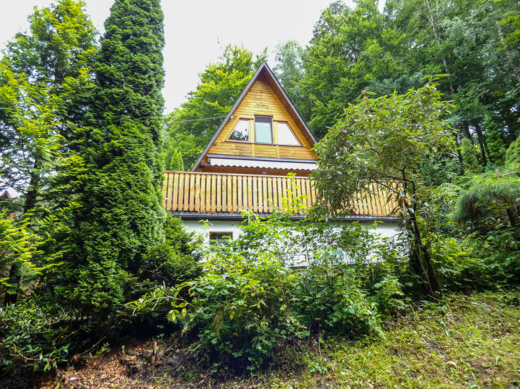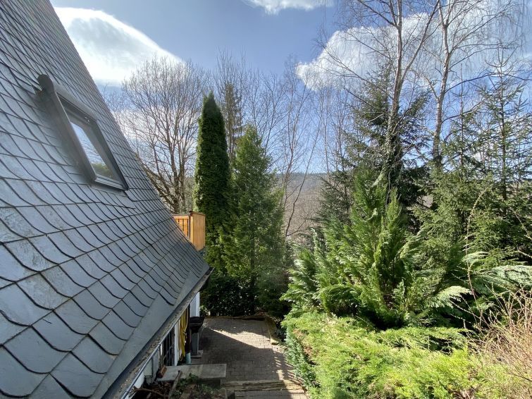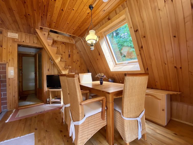 Huis 3-kamers 60 m2 op 2 verdiepingen. Afgeschuinde daken, eenvoudig en met veel hout ingericht: woon-/eetkamer met zwedenkachel en Sat-TV (Flatscreen TV), CD-speler. Uitgang naar het terras. Open keuken (oven, afwasmachine, 4 keramische glas kookplaten, broodrooster, magnetron, elektrische koffiemachine). Bad/douche/WC. Bovenverdieping: (steile trap), 1 kamer met 1 bed (80 cm, lengte 190 cm), 1 2-pers bed (180 cm, lengte 200 cm). Gas-verwarming. Houten vloeren. Groot balkon 16 m2, ruime zithoek in de tuin 30 m2, kleine zithoek in de tuin 20 m2. Balkonmeubilair, barbecue. Uitzicht op het bos. Ter beschikking: strijkijzer, haardroger. Internet (Internet (WiFi), gratis). Koelkast zonder vriesvak, niet rokers woning. Rookmelders, brandblusser.