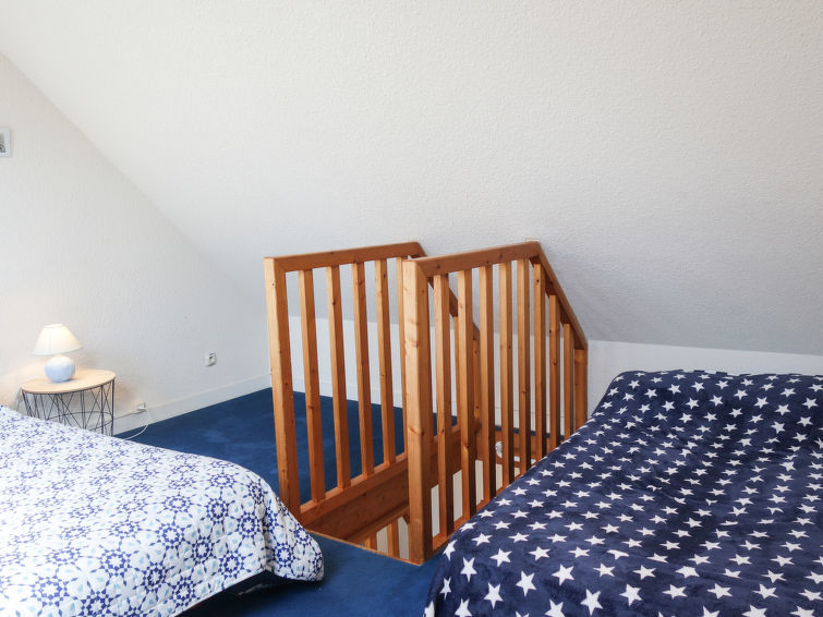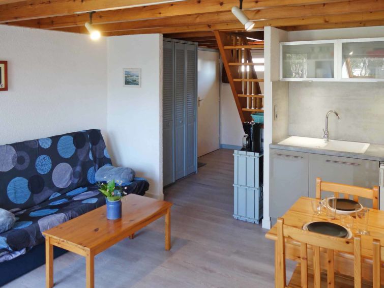 Studio 1-kamer 36 m2 op 2 verdiepingen op de 1e verdieping. Woon-/eetkamer met 1 divanbed en TV (Flatscreen TV). Uitgang naar het balkon. Kookhoek (4-pits kookplaat, oven, magnetron). Bad/WC. Bovenverdieping: (steile trap) galerij met afgeschuinde daken met 1 2-pers bed. Elektrische verwarming. Klein balkon, op het zuiden gelegen. Balkonmeubilair. Ter beschikking: wasmachine. Internet (WiFi, extra). Rookmelders. In plaats van een afgesloten slaapkamer bevinden sommige slaapgedeeltes zich in een open ruimte (galerij, nis, etc.). 56233000137VE