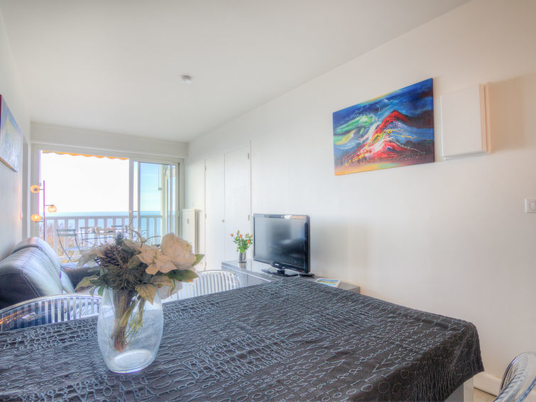 Appartement 3-kamers 54 m2 op de 2e verdieping. Woon-/eetkamer met TV (Flatscreen TV). Uitgang naar het balkon. 1 kamer met 1 2-pers bed (160 cm). 1 kamer met 1 bed (90 cm), 1 x 2 stapelbedden (90 cm). Open keuken (oven, afwasmachine, broodrooster, waterkoker, magnetron, diepvriezer, elektrische koffiemachine). Douche, aparte WC. Gas-verwarming. Balkon 4 m2. Balkonmeubilair. Zeer mooi uitzicht op zee. Ter beschikking: wasmachine. Internet (WiFi, gratis). Parkeerplaats. Woning aan de straatzijde. Niet rokers woning. Rookmelders. 14715000830EP