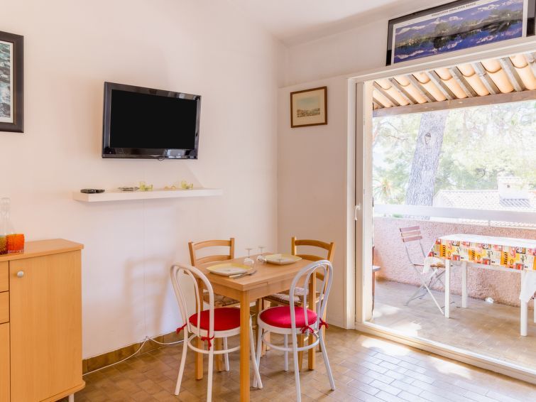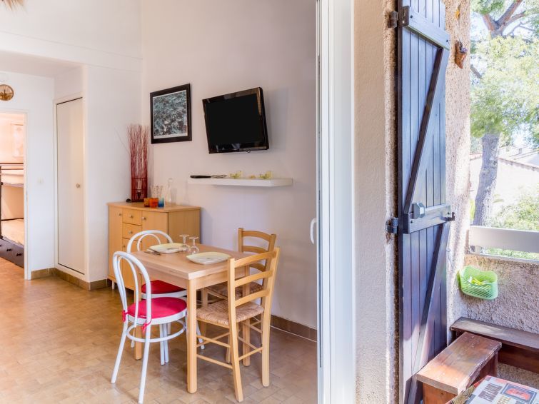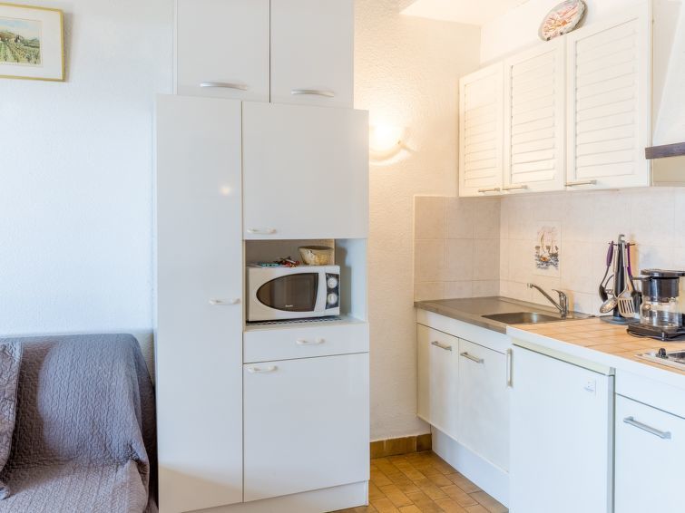 Studio 1-kamer 22 m2 op de 1e verdieping. Hal met 1 x 2 stapelbedden (80 cm, lengte 190 cm). Woon-/eetkamer met 1 2-pers divanbed (140 cm, lengte 200 cm), TV. Uitgang naar het terras. Kookhoek (2 keramische glas kookplaten, magnetron, elektrische koffiemachine). Douche/WC. Elektrische verwarming. Terras 8 m2, overdekt, op het zuiden gelegen. Terrasmeubelen. Beperkt uitzicht op zee. Ter beschikking: wasmachine. Internet (Internet (WiFi), extra). Parkeerplaats nr. 106. Rookmelders. 83112000449FI