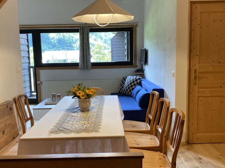 "Hasenstall / Top 8", appartement 5-kamers 79 m2 op 2 verdiepingen op de 2e verdieping. Het objekt is geschikt voor 8 volwassenen + 1 kinderen. Gedeeltelijk afgeschuinde daken, volledig gerenoveerd in 2023, zeer smaakvol en met veel hout ingericht: hal. Groot, open woon-/eetkamer. 1 2-pers. kamer met 1 2-pers divanbed. 1 2-pers. kamer met 1 x 2 stapelbedden. Open keuken (oven, afwasmachine, broodrooster, waterkoker, elektrische koffiemachine). 2 bad/douche/WC's. Bovenverdieping: 1 2-pers. kamer met 1 2-pers bed. 1 2-pers. kamer met 2 bedden. Parketvloeren. Klein balkon 6 m2. Zeer mooi panoramazicht op de bergen. Ter beschikking: wasmachine, strijkijzer. Internet (Internet (WiFi), gratis). Geschikt voor families. Privé ingang, rookmelders, brandblusser, geen lift.
