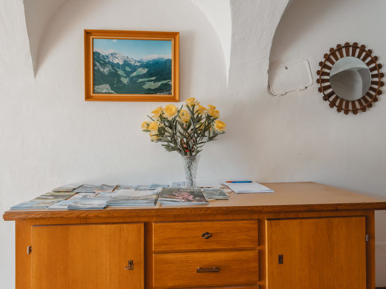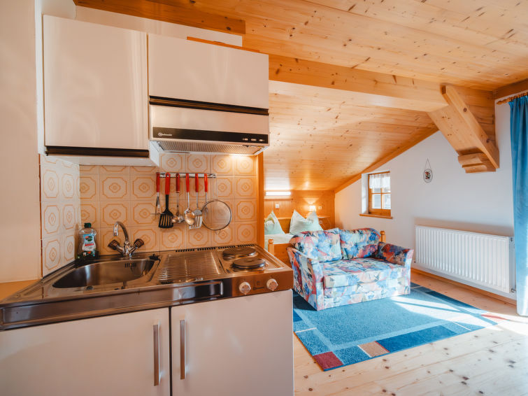 "Weissbacher", appartement 1-kamer 28 m2 op de 1e verdieping. Gezellig en met veel hout ingericht: woon-/slaapkamer met 1 2-pers bed, eettafel en eethoek. Kookhoek (2-pits kookplaat, oven, waterkoker, elektrische koffiemachine). Douche/WC. Verwarming. 1 huisdier/hond toegestaan. 50620-000788-2022